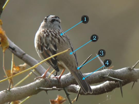 Question 1The feathers labeled 1 are:scapularsnapemantlegreater covertsQuestion 2The feathers labeled 2 are:scapularsmantlerumpuppertail covertsQuestion 3The feathers labeled 3 are:tailuppertail covertsscapularsrumpQuestion 4The feathers labeled 4 are: rumptailmantleuppertail covertsQuestion 5The species is:White-crowned SparrowSong SparrowChipping SparrowBlack-headed Grosbeak