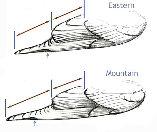 In addition, the length of the exposed tail beyond the primary tips is quite different: about equal to the length of the primary projection on Eastern, but on Mountain the exposed tail is much shorter than the primary projection.