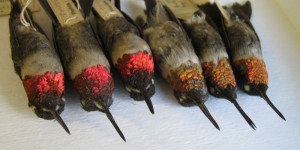 Adult male Ruby-throated Hummingbirds - three in breeding plumage (left) collected in April in Florida, and three in nonreeding plumage (right) collected in Oct-Nov in Mexico. Specimen use granted by Museum of Comparative Zoology, Harvard University ©President and Fellows of Harvard College.