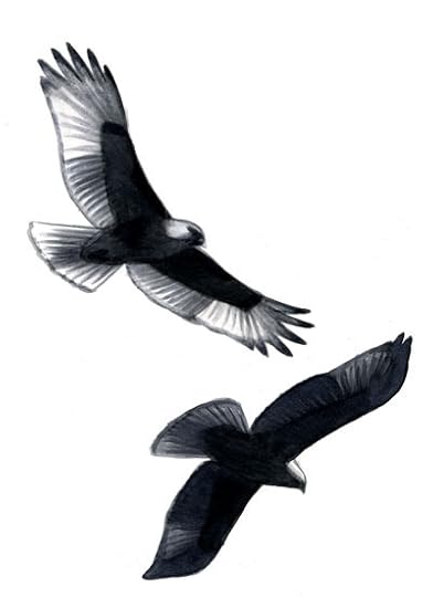 Imagine that the sun is above and to the right of these soaring juvenile Red-tailed Hawks. The birds have the plane of the back nearly perpendicular to the sun (upper) or nearly parallel to the sun (lower). Original gouache painting copyright David Sibley.