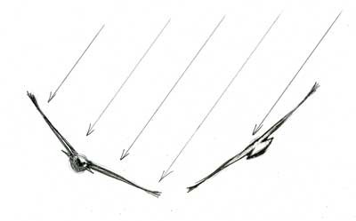 Diagram showing how the turns of a soaring hawk can dramatically alter the angle at which the sun strikes the upper surface of the wings. Original pencil sketch copyright David Sibley.