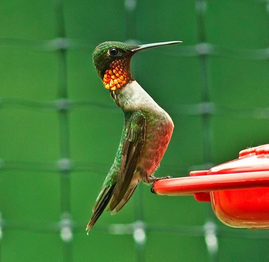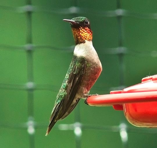 Donna Dittmann, Cathie Hutcheson, and Scott Weidensaul have all told me that they see no difference in throat color in late summer between the old feathers being dropped and the new feathers coming in. Although Sheri Williamson has posted a photo showing a Ruby-throated Hummingbird acquiring new feathers that are more red than the old ones. I wonder which is the norm? Do the incoming feathers usually look a little more red than the old ones, or do they look the same color?