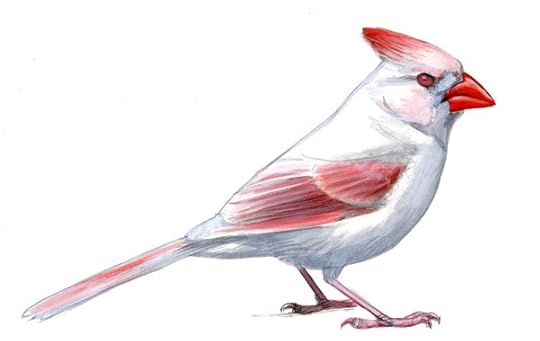 A fully leucistic Cardinal lacking all melanin in all feathers. Original gouache painting copyright David Sibley.