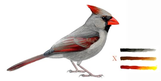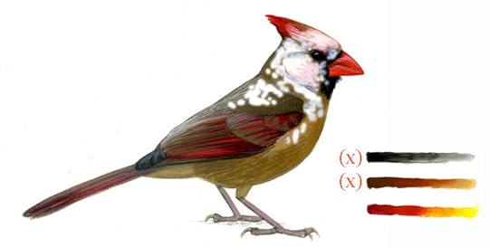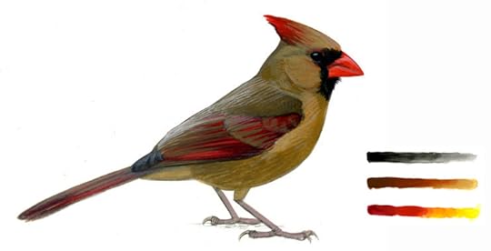 A female Northern Cardinal with entirely normal colors. The plumage color is a combination of black/gray eumelanin, chestnut/buff phaeomelanin, and red carotenoid pigments. Original gouache painting copyright David Sibley.