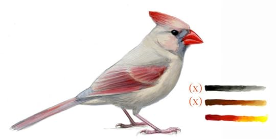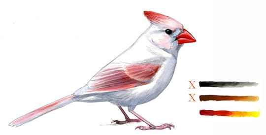 A female Cardinal completely lacking the black/gray pigment eumelanin, this leaves only the rufous to buff phaeomelanin pigment (and red carotenoids). Original gouache painting copyright David Sibley.