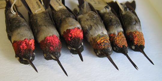 A survey of specimens at Harvard's Museum of Comparative Zoology confirms that all of the winter specimens there have a significantly different throat color than specimens collected in spring and early summer. The photo above shows three spring Ruby-throated Hummingbirds in "breeding color", with three winter birds in "nonbreeding color".