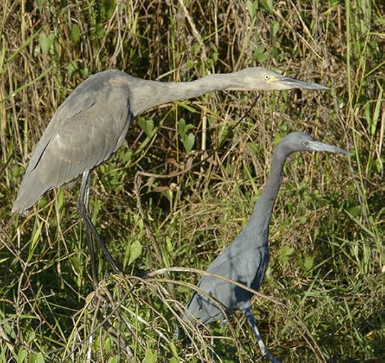 It is rare to see these two species side-by-side, so we rarely get to appreciate the much larger size of Reddish Egret. This kind of grassy freshwater pool is normal habitat for Little Blue Heron, but Reddish Egret is almost always found on expansive shallow saltwater lagoons.