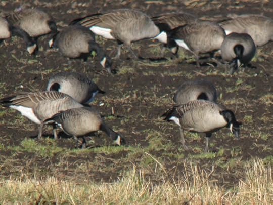 Judging size is harder than it sounds, since the geese are usually moving around, and standing at varying angles on uneven ground. A bird facing away and standing in a furrow will always look smaller than a bird in profile standing on a ridge. In addition, males average larger than females, and size is quite variable overall. You will have to watch a goose move around for at least a few seconds while comparing it directly to other geese to be sure you’re getting an accurate impression of size, and you can expect a lot of “false alarms” of birds that look small at first and then transform into more normal size. If it still looks small from several angles then it is worth closer study.