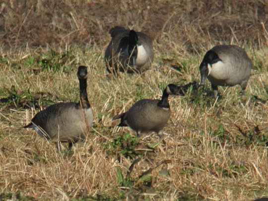 In the first photo the Cackling Goose is the bird in the left foreground with head down; in photo 2 right foreground; in photo 3 second from right foreground with head up; in photo 4 right foreground. All of the other geese are Canadas.