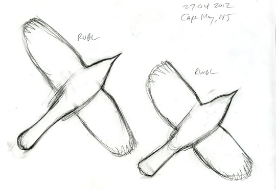The overall impression is of a more elongated, sleeker bird, with long tail, long wings, pointed head and streamlined body. The wingbeats seem a little slower and flight more buoyant. If you want to focus on one thing then tail shape is probably the single best feature to study, but tail shape alone is not enough to identify this species. If you can combine call and shape, then you should be able to make a very confident (even if subjective) identification. If you can hear the song or see the pale eye, then you’re all set and you can make a more objective identification of Rusty Blackbird in flight.