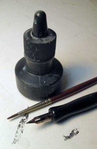 The materials I use now are the same ones I used in the 1970s: a bottle of India Ink, a crow-quill pen nib in a handle, and a watercolor brush for painting ink in large areas, and I work on smooth white paper.