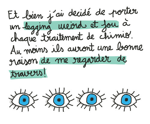 j’ai décidé de me lancer un défi : porter des leggings totalement weird à chaque chimiothérapie. Si je dois me faire dévisager, autant que ça en vaille le coup d’oeil!