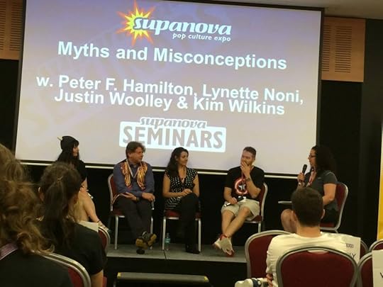 I was also on an author panel each weekend. In Melbourne I shared the stage with Lynette Noni and C.S. Pacat where we spoke about 'Impossible Quests' and how quests and journeys are represented in fiction. On the Gold Coast I was on a panel called 'Myths and Misconceptions' with Peter F. Hamilton, Kim Wilkins and Lynette Noni. Here's a picture of everyone looking at me expectantly, I'm sure I'm about to say something highly intelligent.