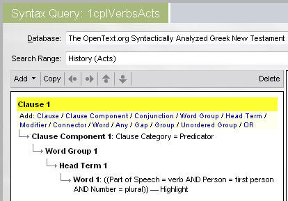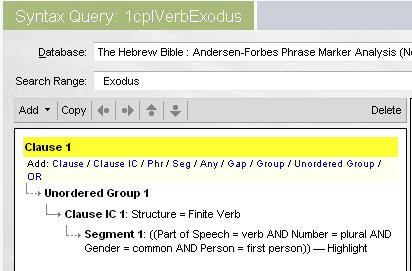The part of his quotation that struck me as suspicious was his notion that in P the anthropomorphism of being seen (Friedman uses the example of Moses at Sinai, J and E) are absent in P. In the query I asked for all the places in P where a deity is the subject of Hebrew galah and ra'ah in the niphal (both mean "to appear" or "be seen/revealed"). Here's what the search looks like in Logos 4 (note how the Andersen-Forbes syntax database contains searchable source-critical tags (J,E,D,P and others) and searchable tags for noun semantics (Subject: "deity").
