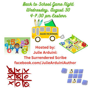Oh, and while you’re here, I have an invitation. I’ll be hosting game night on my Author Page. It’s a fun way to meet and engage with authors. Each author shares a few posts about themselves, and then a game we can play. I’ve never hosted before, and this is a back-to-school edition. Many posts will be sharing that theme.