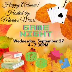 If you read this in time, tonight I’ll be over at Maria’s Muses participating in Game Night. Last month I hosted and it was so much fun. This month I have a game from childhood ready to go. I think you’ll enjoy. Join me and bring a friend!