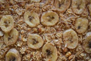 I like to sprinkle with fruit – usually bananas and walnuts – but other fruit works well too.