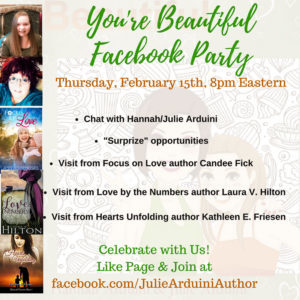 Although technically January 27th was the release date, You’re Beautiful is the new book in the Surrendering Stinkin’ Thinkin’ series my daughter and I wrote together. Celebrate with us Thursday, February 15th, 8pm Eastern on my Author Page as we will talk about the book, promote that it will be a FREE eBook February 16, 17, 18, and offer some surprises and giveaways.You’re Beautiful by Hannah Arduini, Julie Arduini–Hayley Atkinson withdraws from her friends and new opportunities with the new mentoring group, Linked, after she is told a lie that she believes is true about herself. Sabrina Wayson is a mentor in Linked who feels she can’t help encourage girls because she’s struggling as much as they are. Can they surrender the lies and find freedom?