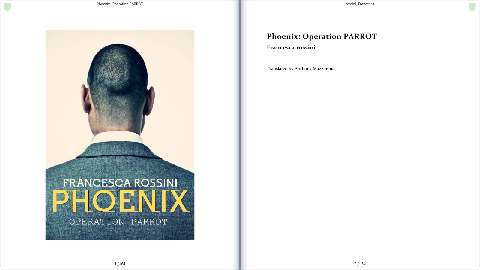 Francesca Rossini is an elementary school teacher. She lives in Manziana, a small, verdant town in the Province of Rome. She has published a story as an ebook with Nativi Digitali edizioni, included in the anthology Storie d'estate. She is an avid reader and loves action-adventure books with plots full of intrigue and danger. She has always nurtured her passion for writing and drawing, having written stories in various formats, as well as fairy tales with illustrations for her students. Phoenix : Operation PARROT is her first novel.