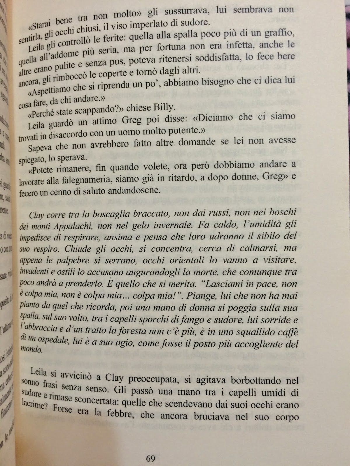Leila continuò a guardarsi intorno cercando di ritrovare la calma: uno stereo, anche quello all’apparenza molto costoso, era in bella mostra in uno spazio apposito nella libreria ben fornita. Leila si avvicinò controllando che Clay fosse ancora in camera sua, aveva libri classici, li sfiorò con un dito leggendo i titoli: William Shakespeare: Amleto, Sogno di una notte di mezza estate e il Macbeth, Kafka Il processo, alcuni libri di Dickens e… “guarda qua” pensò divertita Leila, libri romantici: Orgoglio e Pregiudizio di Jane Austen, Jane Eyre di Charlotte Bronte, sorrise. Poi c’erano romanzi più moderni: La cruna dell'ago di Ken Follett, Intervista col vampiro di Anne Rice, Aspettando i barbari J.M. Coetzee, sorrise ancora vedendo anche Il signore degli anelli di Tolkien, uno dei suoi libri preferiti da ragazzina. C’era anche una copia molto antica di Oliver Twist.