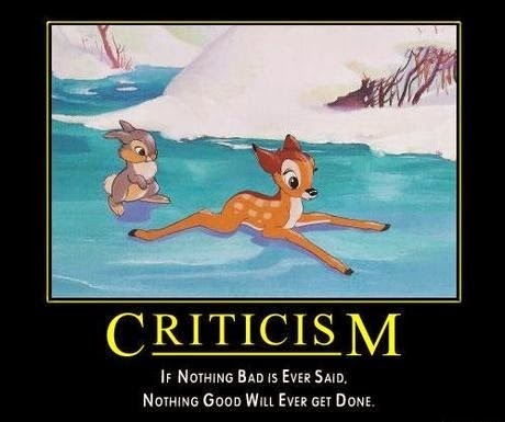 : The people criticizing your story are your audience. You are writing a story to entertain your audience. If your audience isn't entertained, then you need to fix your story. (If you aren't writing your story to entertain... then skip this part.) Constructive Criticism is a WIN-WIN! I LOVE criticism. Any kind will do. Even telling me "You suck, Tig!" is a sort of motivator. Well, maybe not... but you get the point. We are better writers because of those who are brave enough to tell their honest opinion. You can't thank them enough. And to you I say:"Seek out those who are critical of your work, for you may not agree with all they say, but you may find truth in their words."(this is best said in a Patrick Stewart'ish type accent)