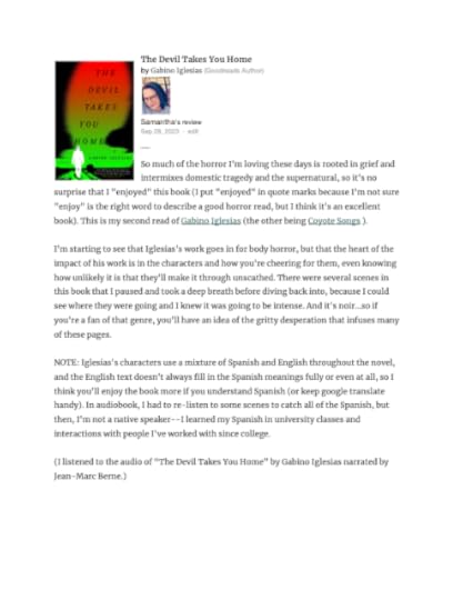 For example, here's a review I wrote of The Devil Takes You Home by Gabino Iglesias, an author and educator I once shared a signing table with at a convention and have a cordial social media friendship with, but whom I can't claim to know well on a personal level.
