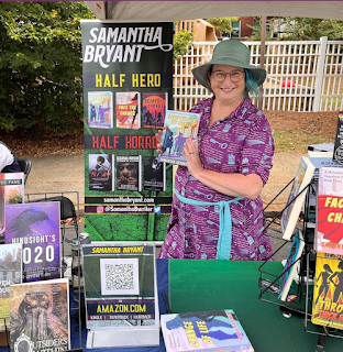 If someone stops and talks with me a bit, I usually first try to see if they're more likely to be interested in my hero or horror stories, usually just by introducing myself: Hi! I'm Samantha and these are my books. I write the Menopausal Superhero series and short form horror, which ones depends on whether I want to save the world today, or watch it burn."
