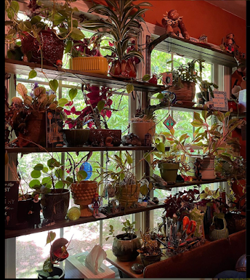 The best part is my plant window. Instead of curtains, I just have shelves across the windows and they are lined with plants and pretty stones and little knick-knacks from my life.