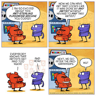 For starters, in these early days, the ethics are unclear. Is this really just a form of plagiarism? Can people really take credit for work co-written this way? Is it just another way exploitative method of undercutting and devaluing writing and art?