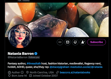 Natania Barron is SO into clothing. Her thread talks are really interesting, even if historical clothing is not one of your core obsessions. She also posts with great openness about her writing life, her struggles with ADHD, and life in general. She's such a genuine and authentic person, even while on Twitter, and I am always glad I've read what she posts. (we share a publisher for some of our work)