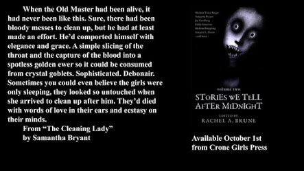 And today, I'm proud to announce that Stories We Tell After Midnight, Volume 2 is released! It includes my flash fiction horror story, "The Cleaning Lady" which came about from my participation in the Nightmare Fuel Project while I was also watching Downton Abbey. The combination left me wondering what the human servants of a creature of darkness might think and say about their employers behind their backs.
