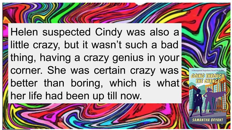 I'm settling in to write novel #4 in the Menopausal Superheroes series. I've been on a hiatus from writing in that series for two years, not because I was done telling the stories but for business reasons (short version: old publisher fell apart, got rights back, republished with a new company. Details in this blog post).