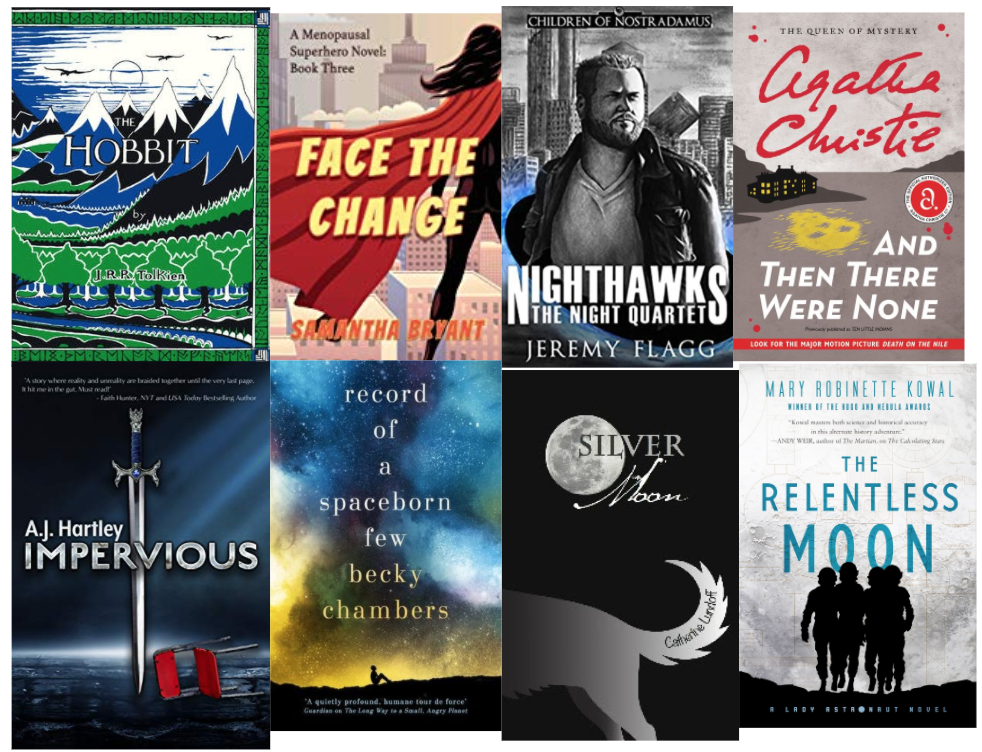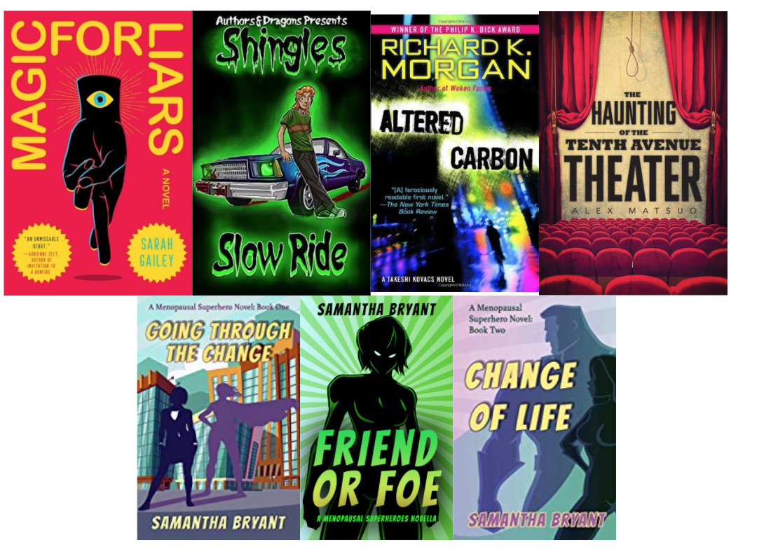 We've got comedy, cyberpunk science fiction, magical fantasy, nonfiction supernatural study, and my own superhero novels. (I'm re-reading my own books because it's been two years since I wrote new material in this series and I'm refreshing my feel for the world before I dive back into writing book four).