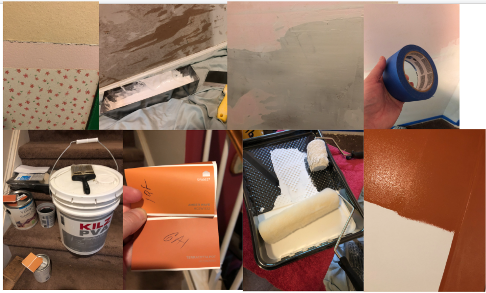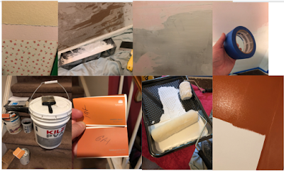 And finally, just this week, I got to start the walls! There was a lot to do--finishing removing the wallpaper, repairing the damage to the wall from peeling off the wallpaper, sanding, cleaning, taping, priming, re-priming, painting, touch-up, and smudging the glaze.