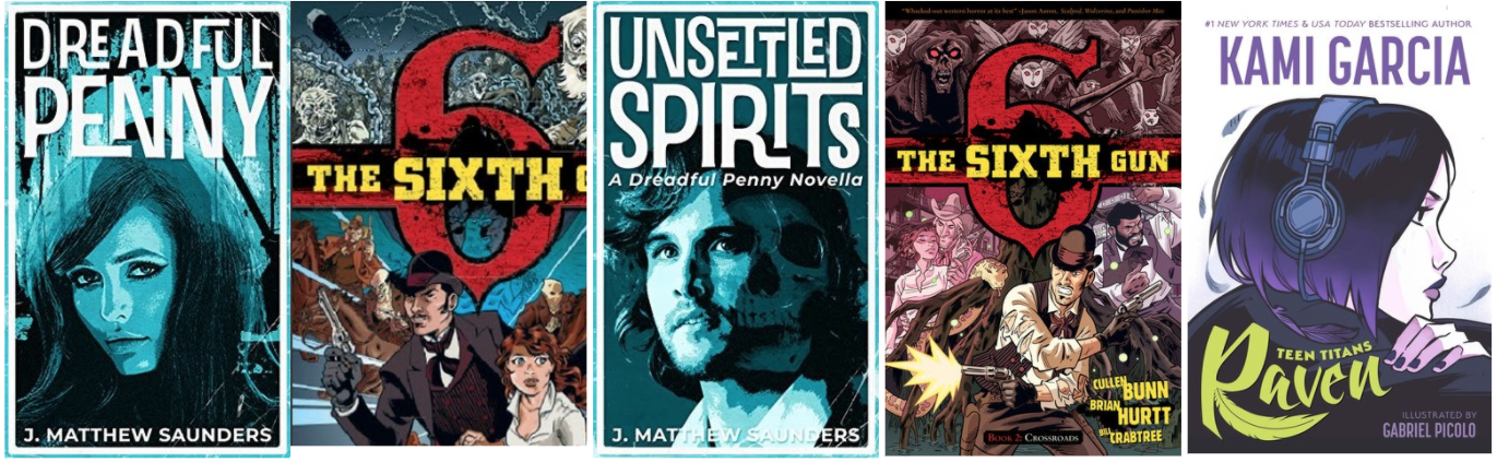 Dreadful Penny and Unsettled Spirits by J. Matthew Saunders, and two graphic novels: The Sixth Gun: Book 1: Cold Dead Fingers and The Sixth Gun: Book 2: The Crossroads by Cullen Bunn, Brian Hurtt, and Bill Crabree.