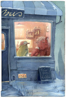 Colorful not in the sense of big personality, but literally in rainbow hues. A woman with pink fur sticking out in tufts around the neck of her white sweater had an arm around a child whose flesh was a startling, vibrant blue. A group of purple, roundish women gathered around the coffeepot. A forest green man leaned into a corner and snored loudly. Herbert rubbed his eyes, but the scene didn't change.