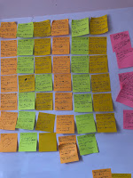 I did this is as a sort of mid-process mapping. I had already written some 30,000 words on the project. So, I mapped out what I had already written, analyzing it for these four things. I added a color coding element because the book balances three points of view (Kye'luh, Malcolm, and Jason) and I wanted to see if they were balancing, so I wrote the scene card on a different color post-it, depending on whose POV it was told in. I used a fourth color for random thoughts I didn't want to lose and left those off to the side.