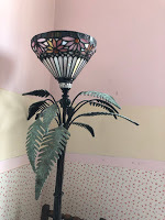 This lamp is a creation of my Mom and Dad's. He wired the metal tropical fern sculpture for electricity and she affixed the Tiffany-esque light fixture atop, combining several of my favorite things into one unique piece to light my writing space and remind me of the love and support my family gives me in these endeavors.