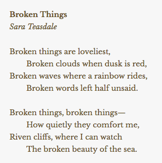 Teasdale's poems have a timeless universality. They're not confessional or philosophical, neither focused on the narrow individual experience nor taking a god's eye view overlooking the cosmos. I don't, at the end of the poem, know why the poet is drawn to broken things at the moment, but I feel with her nonetheless, taking the same quiet comfort alongside her. She finds the emotional center of a moment and gives us room to find ourselves in it.