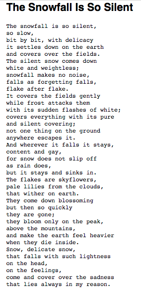 But more recently, her poems have come across my radar from time to time and I found them beautiful and moving. I am older now, which may have something to do with it, and my views have changed about those complex and cynical works I once admired. A lot of it seems contrived and pretentious to me, and sincerity and honesty is exactly what I'm looking for. She feels like a breath of fresh air to me in that way.