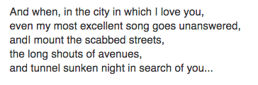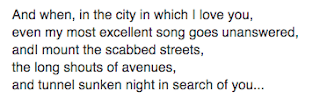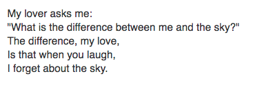 As I clicked on poem after poem, I found short, tight little love poems, full of sweeping passion and glamorous hyperbole. His work made me think of the part from Dead Poet's Society about what poetry is for: