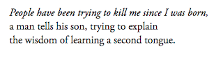 Lee's poems pull from both the personal and the political to give a vision of a wanderer seeking home. I'm drawn in by the yearning of the poems, because there's an echo of it in my own heart, still, even now that I am older and much more settled. His work touches the melancholy in me, without dragging me down into depression or burning me in anger.