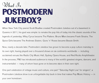 Then my husband introduced me to Postmodern Jukebox, now one of my favorite musical acts. I'm not such a "live music venue" girl (I like control over the volume), but I joyfully went to one of their concerts with Sweetman. Kind of like Retrofuturism in literature, they take old songs and make them new by making them older--singing them in styles of the 30s to 60s.
