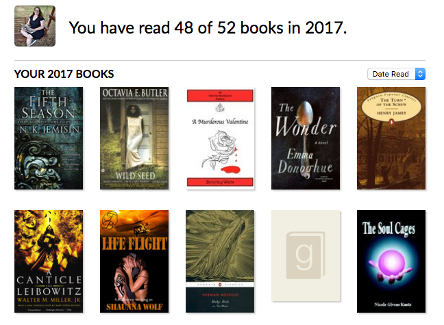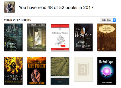 Goodreads says I've read 48 books in 2017. That's a little off. Three books got counted twice in different editions. One is a book of writing prompts, which I did look through and use some of…but did I "read" it? Not exactly. So, let's call it 44 books. Not bad, especially when you consider the busy-ness of my life (day job, writing life, two kids, husband, rescue dog, occasional social life).