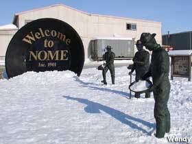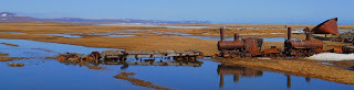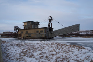 The Last Train to Nowhere is a rather poetically named tourist attraction. It's a train that has been left to sit on the tundra, stopped "in its tracks" forever. The locomotives were part of the mining history of Nome, once famed as a gold boomtown. Nome is littered with machinery that was brought in to excavate the riches of the earth in the 1880s, then left to rot because it was too expensive to haul it back out again. There's a small tourist industry built up in showing people these remnants of the boom times of the town and countryside.