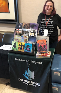 The logo and imprint name "Dangerous When Bored" on my table runner will often elicit a smile from someone walking past my table at an event, and that might make them slow down and look at my covers. The "half hero/half horror" with book covers gives a reader a hint even at a distance what my most common genres are.