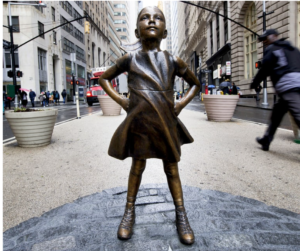 As soon as I saw her, hands on hips, and her chin jutting out toward that bull, I loved her. Yes, I know she is white girl and that’s not intersectional enough for me. Yes, I know she was put there by Big Money and that means they have their own corporate interests at the center.