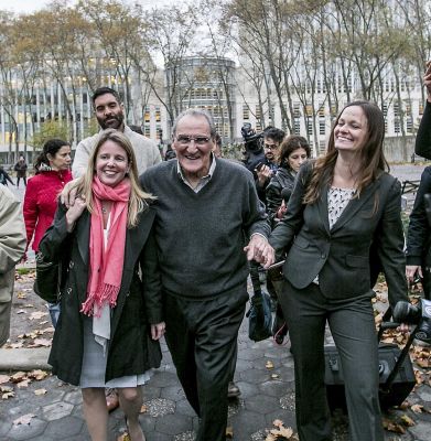 Asaro departed Eastern District Federal Court in Brooklyn on Thursday, Nov. 12, 2015, after being found not guilty of masterminding the infamous $6 million Lufthansa heist at Kennedy Airport in 1978. His attorneys, Elizabeth Macedonio, left, and Diane Ferrone walked with him.