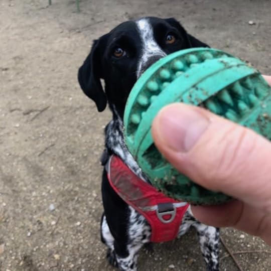 Again several options were considered. We could keep her constantly on the lead but such extreme restraint for an animal with this energy level seemed close to cruelty. We tried a dog whistle and the ringer on her (real) GPS tracker but neither had any effect when she was in hot pursuit of a deer or a hare. So we opted for weighing her down with her Paris harness and the long plastic training lead I bought for her in Berlin. Thus equipped she sticks to the path, trots along with, rather than runs away from, us.