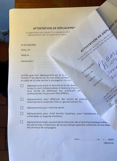 Especially since the confinement rules here in France have become even stricter. Outdoor exercise is now limited to within 500m of the house, leaving my friend Tala who lives near les Invalides to run round and round the grass plots on the avenue de Breteuil like a hamster. My friend Louise who lives at Montmartre runs up and down the stairs to the Sacré Coeur. It's farther than 500m from home but: "The police can't catch up with me," she says, "I'm so fleet of foot." Fines have gone up from 135 to 200 euros. A new form requires time of departure and place of birth (I have yet to hear a convincing rationale behind the latter bureaucratic flourish).